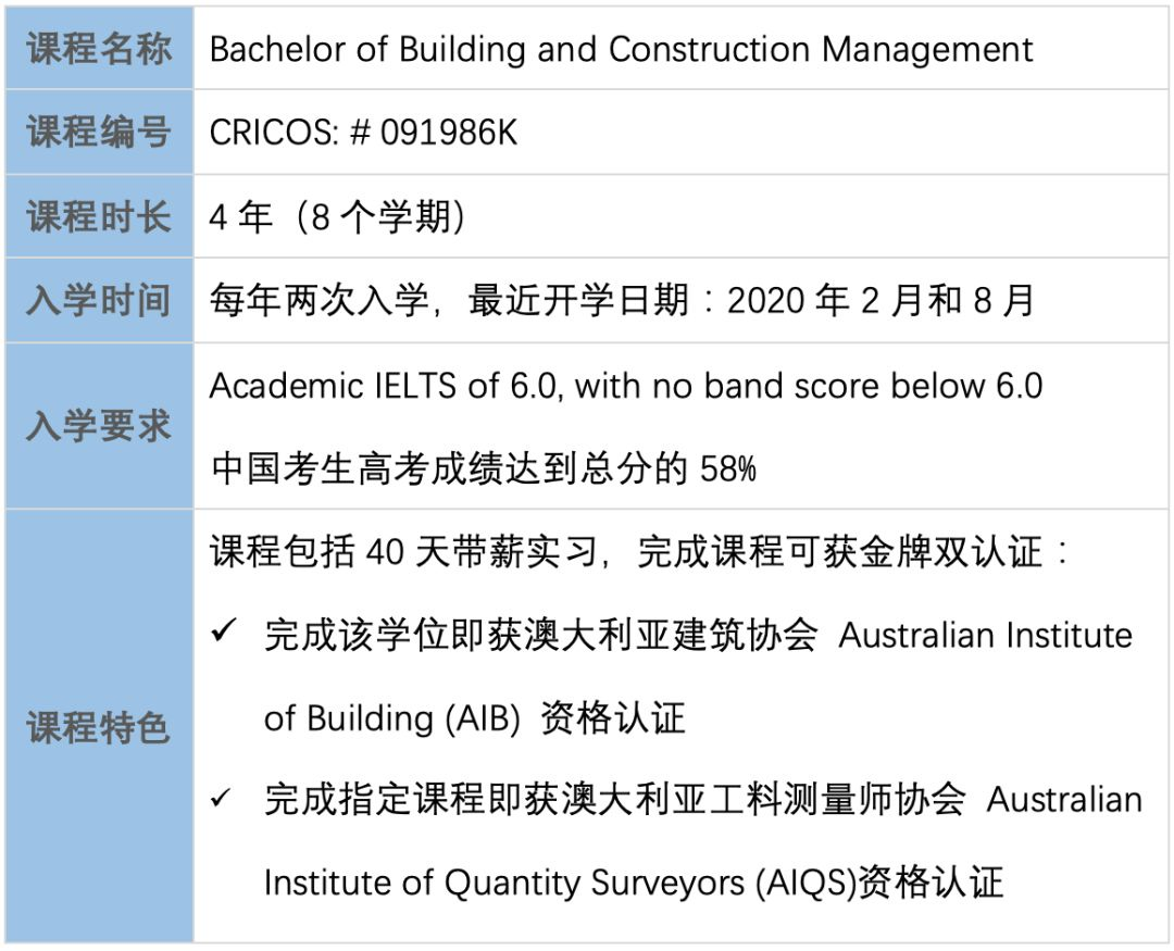 完成该学位即可获得 澳大利亚建筑协会 Australian Institute of Builing (AIB) 资格认证;