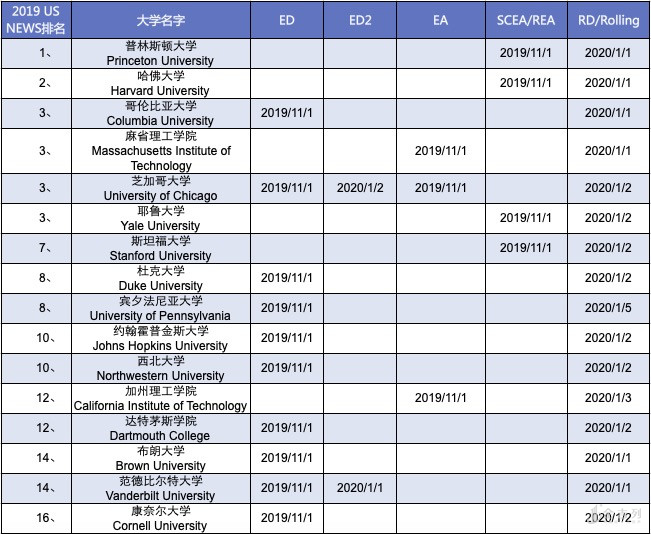 《2019-2020美国TOP50综合性大学申请截止日期》