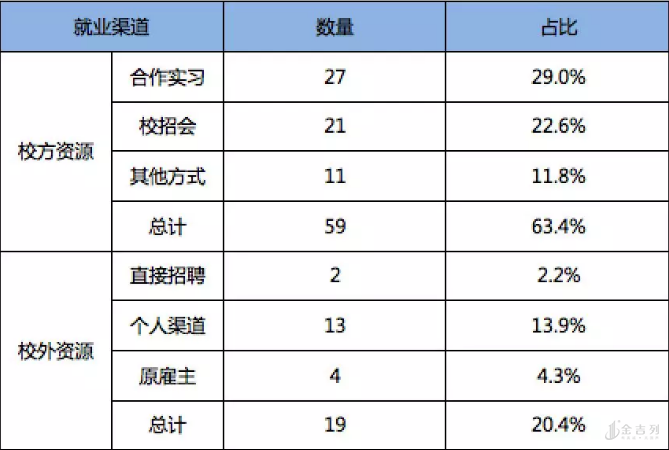 从上个图表可见,就业渠道中的校方资源占比63.4%,是大部分学生尤其是国际生的最重要渠道,我们在选择学校的时候,一定要将商学院对于学生的就业服务考虑在内。