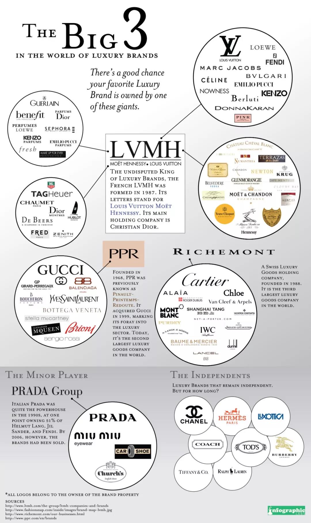奢侈品“三巨头”:LVMH, 开云(Kering, 曾名PPR), 历峰 来源:Infographic Labs
