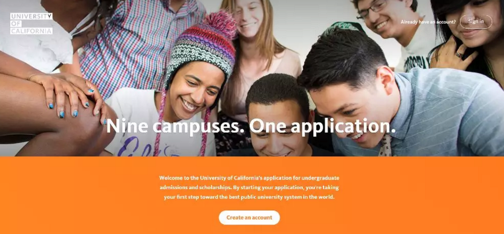 除了加州大学旧金山分校(只提供研究生院)之外,加州大学9个校区都共用同一个申请系统——UC网申系统。这个系统的好处就是,无论你想申请多少个校区,都只需要提交一份申请。这9所本科院校包含150个学科,学校的学术系部在全国排名前十的公立或私立大学中也是最多的。且加州大学一向以热情、开放、多元化著称,因此也愿意广泛接纳留学生。每个校区的申请费为80美金。