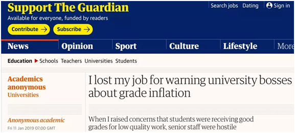 由于担心学位膨胀,一所受欢迎且发展迅速的大学减少它授予的一等学位的数量,以确保其学位的价值,保证英国高等教育的声誉。 此类大学的决定可能会阻止部分学生申请这所学校,并导致学校在以成绩比例为基准的国家和国际排名表中名次较后。 BBC 此前曾报道如果大学授予过多的一等学位,它们现在可能会受到政府评级系统的惩罚。 英政府表示发放的一等学位增多,一等学位的含金量就下降,会破坏雇主对英国大学评判标准的信任。 据《卫报》报道,一位有经验的讲师被迫失业,起因竟是担心学生因低质量的学术表现而获得良好成绩时,他试图向学生解释学位膨胀,却遭到了他们的冷漠和恼怒。同时被同事拒绝和排挤,最终还被学校解雇。