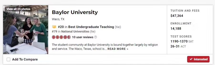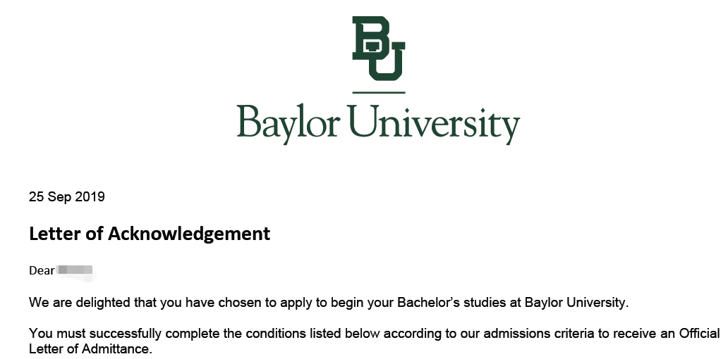 Chen同学最后以雅思5.5分申请破格直录申请到美国本科教育排名20的贝勒大学。我觉得成功的原因有两个,每一个是学生能够积极主动的和我保持紧密的沟通,另一个是学生自己本身有非常强的主管能动性,学生一直积极的联系学校,通过电话和邮件的方式和美国的校方取得联系,给学校留下了非常深刻的印象,我觉得留学一直不是交了钱做甩手掌柜可以做好的事情,是大家一起合作的共同结果,chen同学现在开始做签证继续保持沟通 期待一切顺利