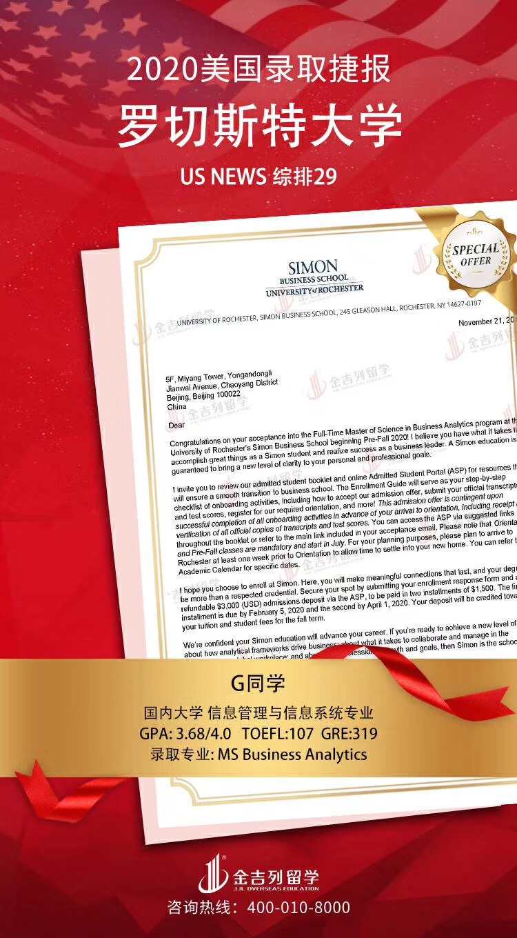 2020秋季US News #29 University of Rochester, 录取专业分别是MS Business Analytics 和 MS Finance, 两枚罗切斯特大学录取,再次感谢高端文案部付树梅老师付秀丽老师