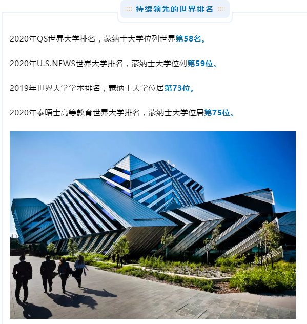 蒙纳士大学是澳大利亚八校联盟成员大学 (Group of Eight) 之一。这所久负盛名的世界名校,一直保持着卓越的教学质量与科研成果,其教学和科研均获得国际高度认可,使得蒙纳士大学常年稳居全球大学百强之列!