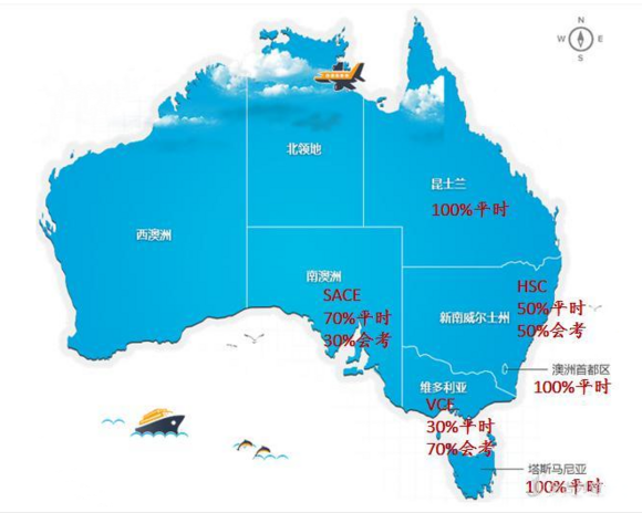 不过各州的高考分数 最终会换算成全国统一的录取标准:ATAR分数 (Australian Tertiary Amission Rank),方便学生跨州报考大学。 然后,澳洲的“高考”并非“一考定终身”。学生最终成绩由平时成绩和高考成绩两部分组成 。从11年级(即高二)开始,学生每次作业、测验与考试的成绩都计入平时成绩,正式高考之前,还会参加一次全州统一预考(Trial exams)。预考成绩和平时成绩综合后,占到大学录取分数的50%,另外50%则是高考成绩(具体百分比每个州存有差异,具体见下图)。