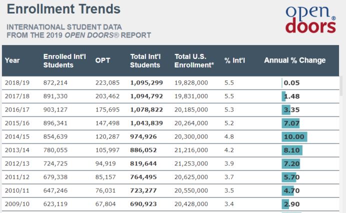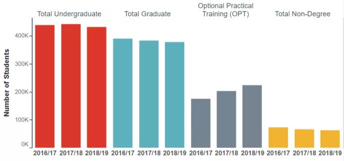 根据最新的门户开放报告显示, 2018-2019 学年的国际生就读人数有所下降 ,为 872,214人。另外,2016年 (903,127人) 是十年间的最高峰值,之后便 连续三年下降 。不过,与前两年相比, 下跌幅度趋缓 。2018-2019 下降了 0.9%,前两年的下降幅度分别为 6.6%和 3.3%。