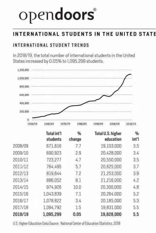 总体来说, 在美国的国际学生总数是呈上升趋势 ,2017-2018学年总人数为1,094,792,2018-2019学年为 1,095,299人,同比增长 0.05%。