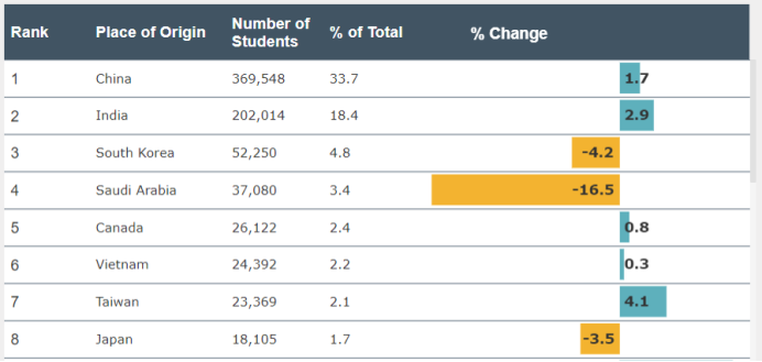 这些都有可能导致学生数量产生变化,而不是像网络传言或大家想当然的,皆是美国的签证、留学政策变得很严峻才导致。其中最明显的例子就是沙特阿拉伯学生数量的变化,仅仅是因为政府奖学金计划的缩减。