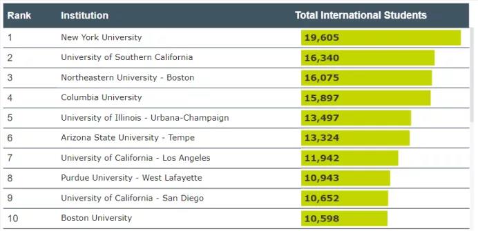 但国际生人数第一高的并不是加州的学校,从图例中可以看出, 纽约大学留学生才最多 ,在 2018-2019 学年共有 19,605 名国际生在这里就读。其次才是南加大、东北大学、哥伦比亚大学、伊利诺伊香槟分校。