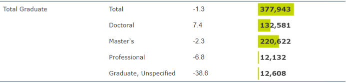 国际研究生人数共有 377,943 名,其中硕士研究生 220,622 名,下降了 2.3%。博士研究生 132,581 名,提高了 7.4%。