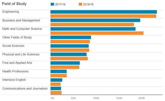 但与 2017-2018 年度相比,最显著的一个变化是 数学/计算机科学(203,461人)超过了商科/管理(182,170人) ,成为国际学生中的第二大热门领域。数学/计算机领域的比例增长了 9.4%,而商科领域下降了 7.1%。