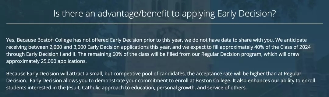 学校取消EA的这一举动,说明了BC也渴望招收更多“最合适”的申请者,他们希望自己是学生们的“唯一”而不是“备胎”。在BC的官方网站上,也明确写明了ED申请的优势。