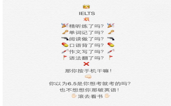 除成绩外,就是语言能力证明——雅思。“屠鸭”的艰难,真的在每一个学生的身上都看到过。是历练是噩梦,是不停的打怪升级去登顶。雅思虽满分9分,但0.5就是一个坎,研究生的雅思要求基本在总分6.5,单项6.0。大学考过四六级的,对等雅思基础可能会在5.0-5.5,所以提升到6.5,是真的需要咬牙坚持,不停的去刷去做去积累去付出。看到过太多学生总分达到,小分被限制,听说读写很难全部兼顾的,但这是必须的,不单单只是成绩证明,也是为了提升自己的语言能力。出国的前提就是语言要能跟上,要能够听懂交流,否则再怎么学习能力强,听不懂也是白搭。
