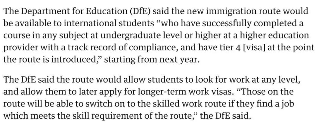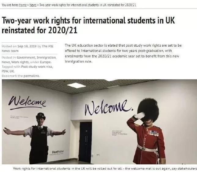 英国教育部门表示:英国将向国际学生提供毕业后两年的毕业后工作权利,2020/21学年的入学学生将受益于这项新的移民规定。