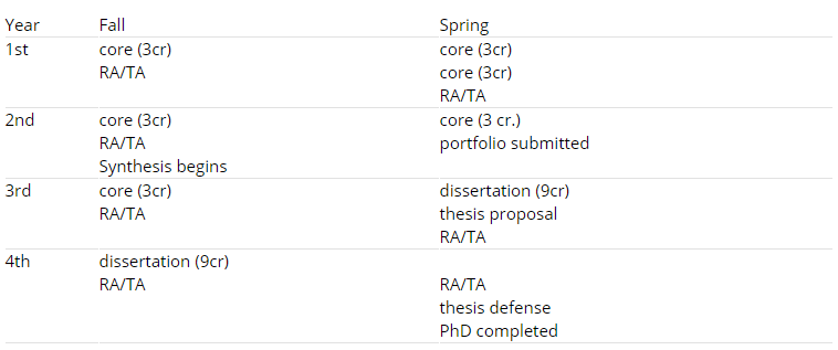CS博士课程时长为4年,基本的学期课程时间安排如下: