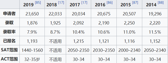 秋季入学统计2019 2018 20172016 2015 2014 申请者23,65022,03320,03420,67520,50719,296录取1,8761,9252,0922,1902,2502,220录取率7.9%8.7%10.4%10.6%11.0%11.5%已报名1,193不适用1,2151,1211,1161,152SAT范围1440-1560不适用2050-23502030–23502000–23402050–2340ACT范围32-35岁不适用30-3430–3430–3430–34
