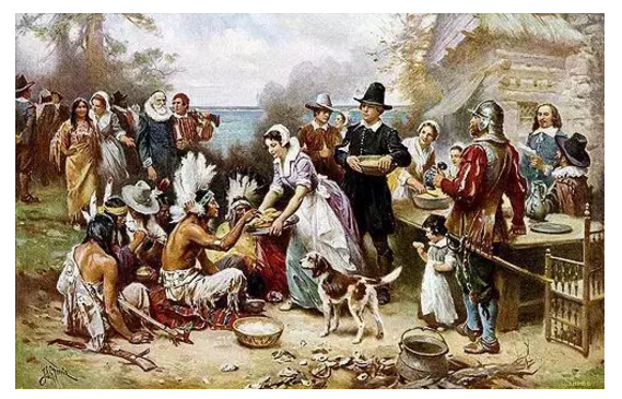 为感谢在危难之时帮助、支援过他们的印第安人,同时也感谢上帝对他们的“恩赐”,第二年的11月第四个星期四, 逃亡的英国清教徒们将猎获的火鸡制成美味佳肴,盛情款待印第安人 ,欢庆了三天。