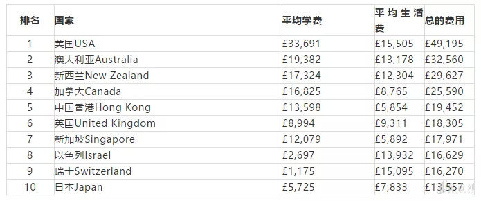 而第二热门目的地英国排在第六位。平均学费 8,994 ,总费用 18,305 。加上英国研究生一年学制,如果一直在英国读到研究生毕业,其实费用上还是能节省不少钱。