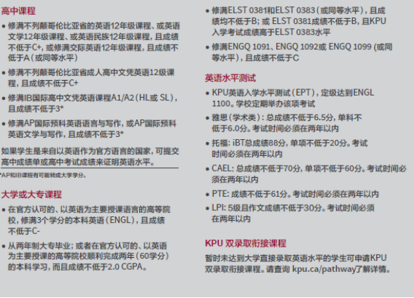 - Kwantlen Placement Test:KPU定制的英语测试(按成绩分配到ENGQ 1099, ENGQ 1091, ENGQ 1092 或 ELST 0381等预科课程,课程指数越高则越高级)