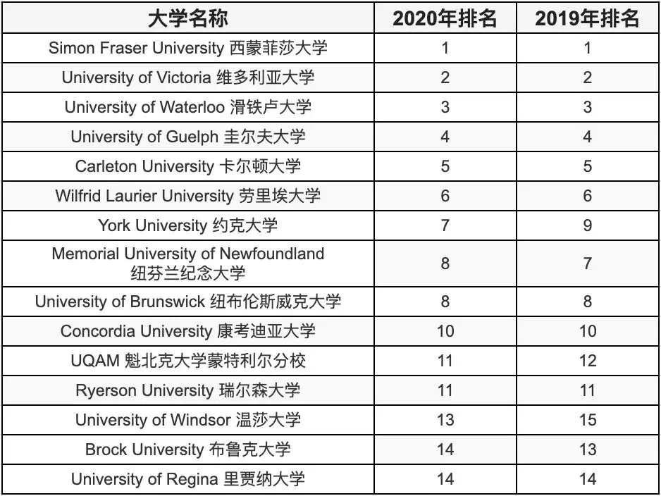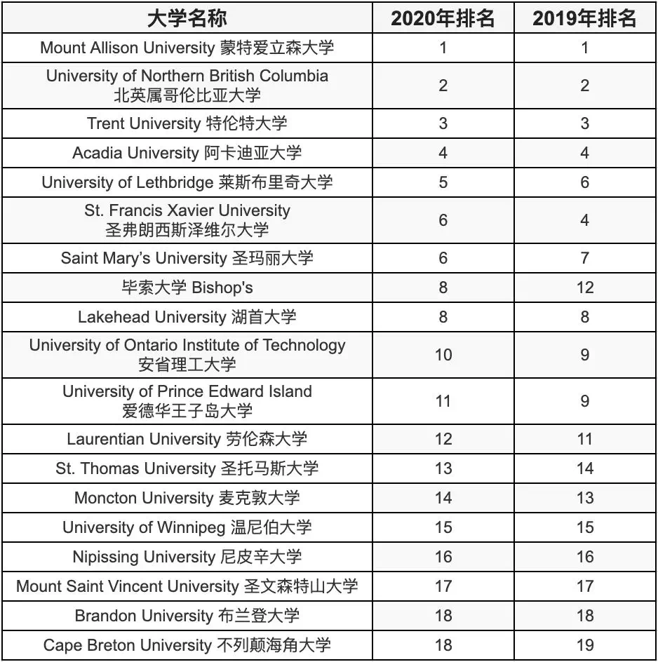每年,加拿大高校的权威排名由麦考林杂志(Maclean’s)发布。麦考林综合考察各大学的师生比、科研经费、论文经费、人文社科奖、大学声誉等14项数据指标,按照基础类、综合类和医博类对各类型大学进行排名。