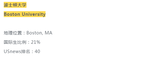 地处波士顿市中心的波士顿大学(BU)也是很多学生的ream school,校园闹中取静,交通便利,地下铁横穿校园,又临查尔斯河畔,学习生活环境十分理想。 且BU是一所国际化程度比较高的学校,有非常多来自全世界各地的学生,国际生占比高达22% 。