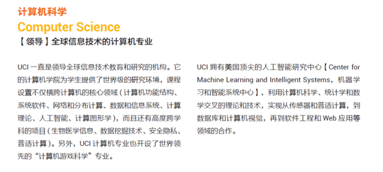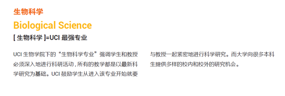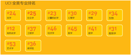 UCI 在最优秀的 100 所建校历史不足 50 年的学校中排名全美第一、世界第五,其既有大型科研学校的教学实力,也有小型院校的友好氛围,拥有诸多优秀的研究生专业包括法律、商学、工程学、人文学科、经济学、医药学、护理学、化学、生命科学、物理学、数学、计算机科学。加州大学欧文分校虽然建校时间短,但在 2020 年 USNEWS 大学(本科)排名中位居第 36 位 ;在 2019 年 USNEWS 公立大学排名中位居第 7 位。