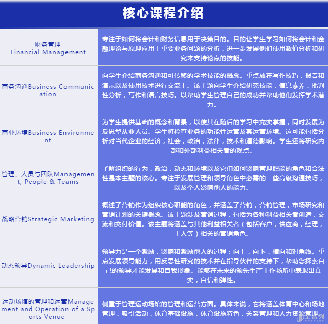 课程全日制,为期两年 ,将商业管理和体育管理完美结合,为致力于体育领域和行业的毕业生提供实际技能和高级知识体系,以团队合作、决策和战略计划为主题,顺应不断变化的商业环境。