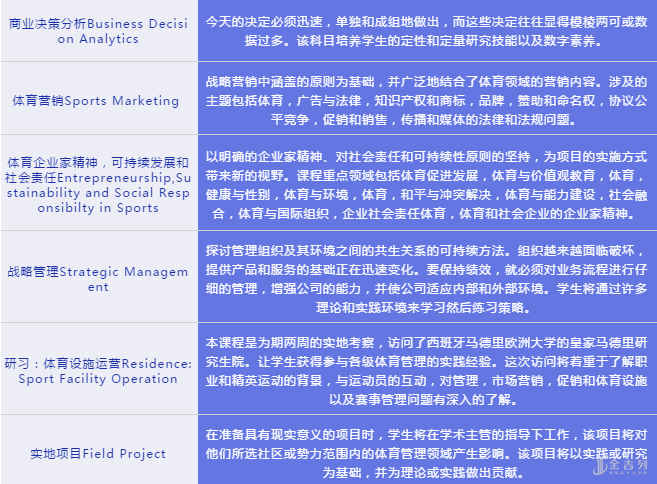 课程与誉满全球位于西班牙马德里的欧洲大学皇家马德里研究生院(Real Mari Grauate School at the Universia Europea e Mari, Spain)合作,后期将前往皇家马德里足球俱乐部进行为期两周的研习。