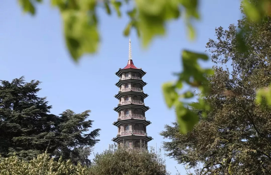 伦敦皇家植物园里的中式宝塔,在春风中屹立。
