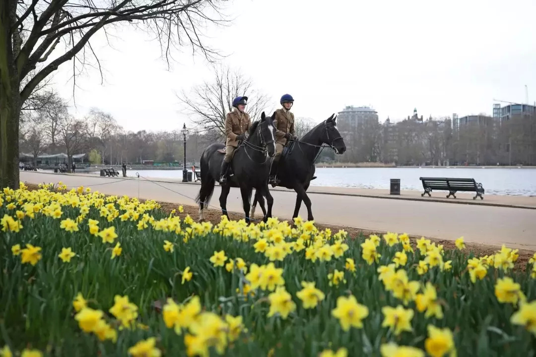 皇家骑兵在布满鲜花的海德公园里巡视。