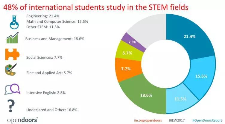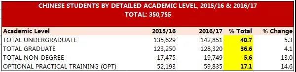 数据显示,从2015年开始,中国赴美读本科的总人数已经超过硕博人数。35万多中国学生中,有40.7%是本科留学生,36.6%是研究生留学,17.1%是OPT,5.6%是其他。