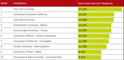 上图展示的是留学生人数最多的10大美国高校。 纽约大学连续四年国际学生人数排名第一,拥有全美最大的留学生群体。南加州大学仍然是第二大领军人物。哥伦比亚大学、东北大学、亚利桑那州立大学、伊利诺伊大学香槟分校、加州大学洛杉矶分校、普渡大学、德克萨斯大学、宾夕法尼亚州立大学紧随其后。