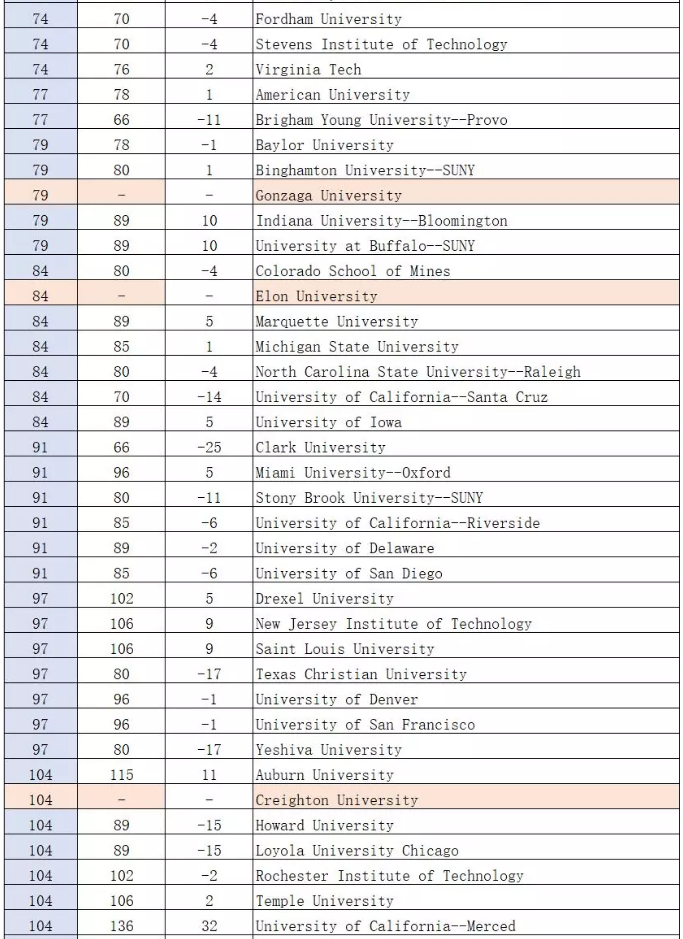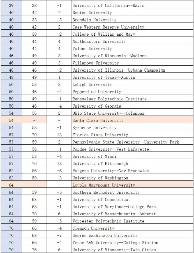 大家可以发现前30名的院校变化不大,这些学校普遍学术能力强,发挥也比较稳定。2020年榜单排名40位的东北大学和杜兰大学,相比2019年上升了4位,属于排名靠前的学校里上升排名比较明显的。佛罗里达州立大学和匹兹堡大学分别上升了13位,来到了50+的档位,像是匹兹堡大学,一直以来世界排名都很高,但美国本土排名稍靠后,今年的名次提升也算是给匹兹堡“正名”啦。之前文章中我有写过的南佛罗里达大学,也一路高歌,今年来到了104位,也许明年后年真的要像校长说的一样,挺近前100了。