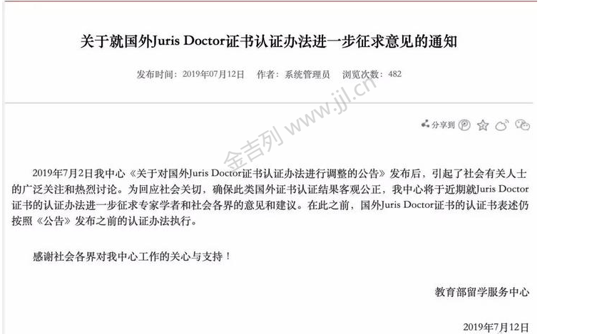 为回应社会关切,确保此类国外证书认证结果客观公正,我中心将于近期就Juris Doctor证书的认证办法进一步征求专家学者和社会各界的意见和建议。 在此之前,国外Juris Doctor证书的认证书表述仍按照《公告》发布之前的认证办法执行 。