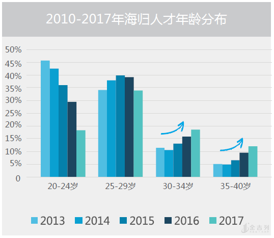 虽然目前来说,20-29岁的年轻人是海归中的大多数,但从时间轴上来看,2013年到2017年,20-24岁(毕业即回国-工作2年后回国)的人回国比例大幅下降,也就说越来越多的人偏向在国外积累了一定工作经验后再回国;