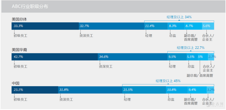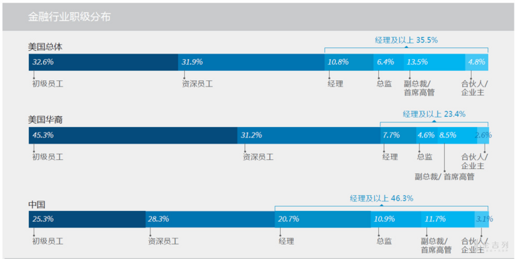 以最热门的金融行业、ABC行业(AI 人工智能/Big ata 大数据/ Clou computing云计算)为例,在美华人中经理及以上职级比例均低于美国总体水平,与中国国内的水平相比差距更为显著。也就是说在美国就业的华人,更容易触及到职业天花板,而在国内则能找到更多机会。