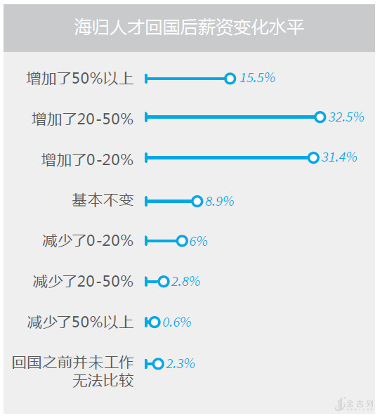 如果在海外有过工作经验,回国后32.5%的人薪资能有20-50%的涨幅,31.4%的人涨幅在20%以下。