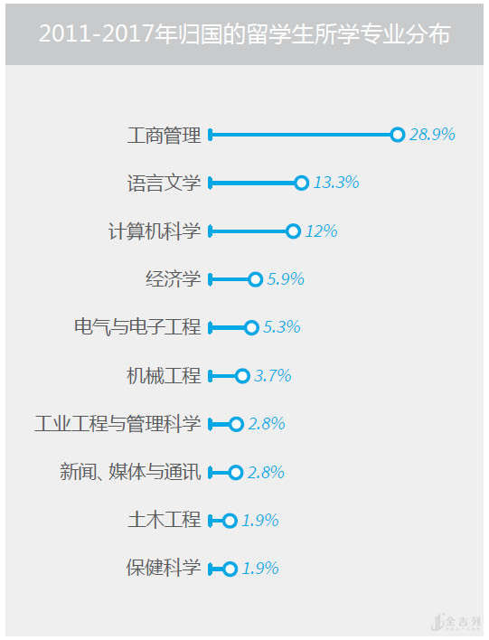 从2011-2017年海归的教育背景来看,工商管理和语言文学这两个专业的人占了总体的42.2%。一方面来说,文科和经管类专业相对来说留美工作有一定难度,另一方面,申请这类专业的同学总量也不少。但值得注意的是,在这6年间,计算机科学相关专业的海归增加了2倍多。