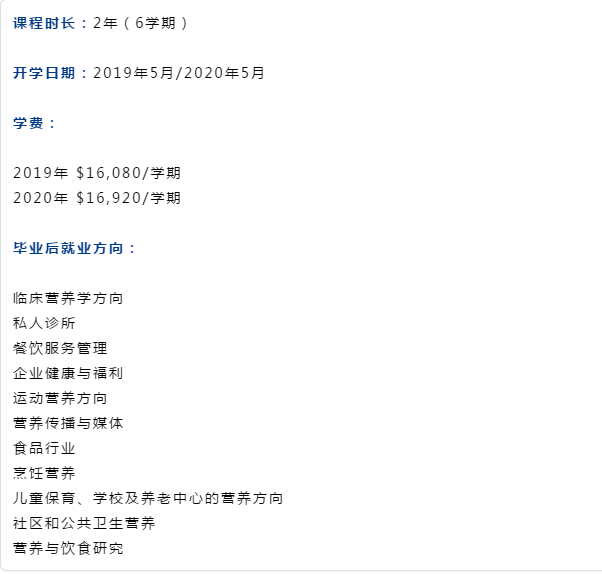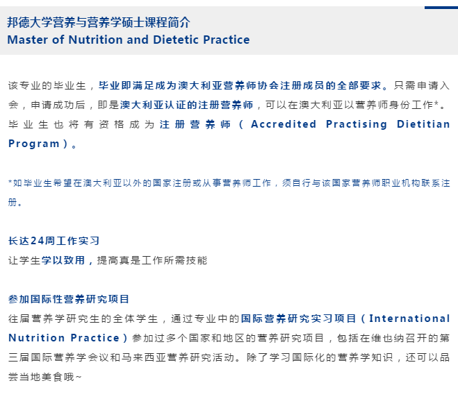 - 课程重点 —— 课程是否会注重培养学生特定领域的工作技能? 可能会是医院、公共健康、食品服务、研究或者媒体方面。比如说, 邦德大学的营养学课程着重在研究、国际营养领域、临床技能和创业方面。