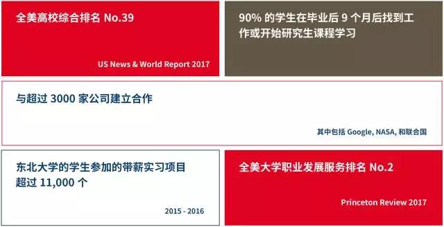 东北大学成立于1898年,大学的主校区就位于历史名城波士顿的中心,来到这里学习,你将充分融入美国式的学术氛围和充满生机的社区生活。大学连续多年排名全美前50,是全美最大的私立大学,在美国极富盛名,目前约有来自世界各地的2万名学生在东北大学学习。