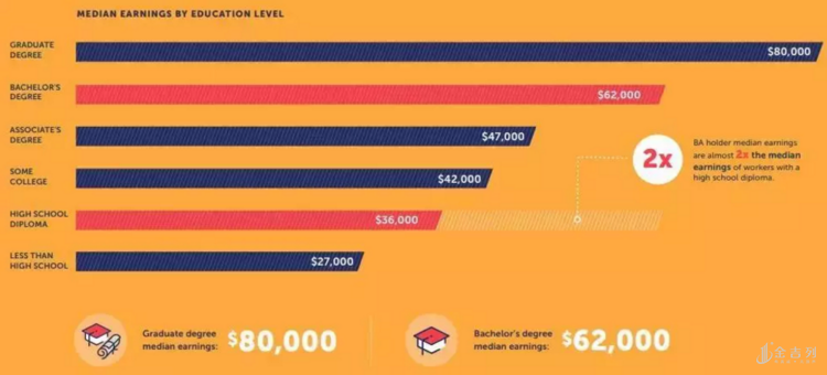 美国劳工统计局BLS也显示,拥有硕士学位的人的收入中位数比拥有学士学位的人高出近20%,而博士学位课程毕业生的收入则高出50%以上。