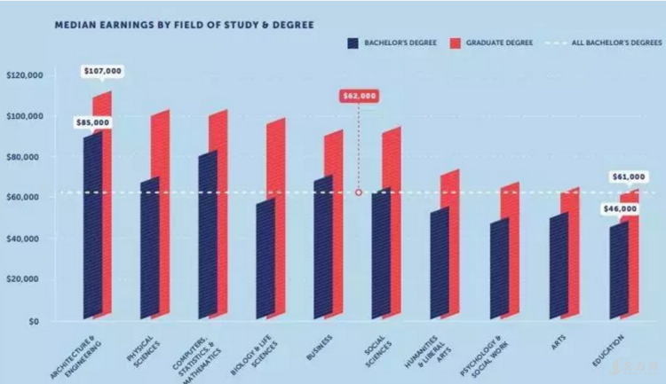 当然,薪资上涨幅度根据不同专业有所变化。乔治城大学的研究中有一些数据可以很好地证明这一点。例如生物学和生命科学的研究生学位持有者每年可赚约10万美元,比学士学位持有者增加三分之二。相比之下,艺术和教育领域的研究生学位只增加了约三分之一的收入。