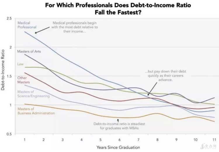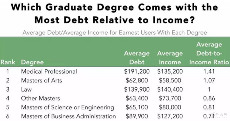 Priceonomics网站根据Earnest的数据,统计出了部分专业学位(医学、牙医、药剂学、 MBA、JDs法学硕士、计算机工程、艺术、其他)的投入产出比。