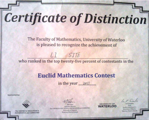 (这是冯老师的学生获得欧几里得数学竞赛全球前25%的证书)