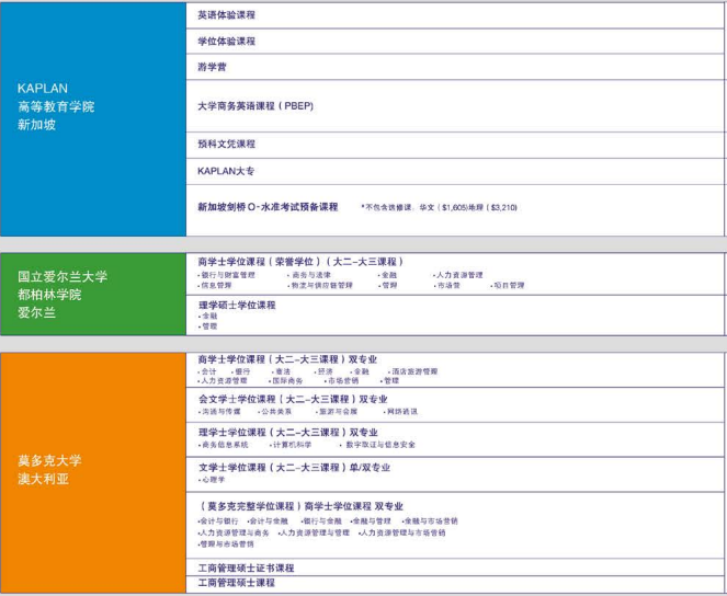 楷博高等教育的双联课程学位文凭与校本部完全相同,被全球任何国家认可,学费仅是校本部的二分之一。优秀生最高可获高达10,000新币的奖学金,并在获得学士学位后在楷博高等教育(新加坡)直升硕士学位课程。 楷博高等教育坐落在新加坡金融中心的Kaplan Singapore校区,现代化、智能化的市区校园,舒适的教学环境及备受信赖的品牌,吸引了无数来自世界各地的学生,有15000 名新加坡本地学生和国际学生。Kaplan为学生提供优质的学士、硕士及博士课程和ACCA、CAT、CFP、CFA金融专业证书课程。