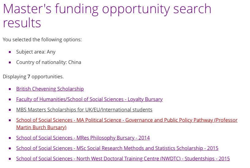 基本上所有的大学助学金只提供给英国及欧盟国家的学生,即Home/EU Only,中国学生基本上都没戏;