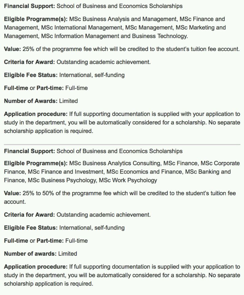 基本英国大学的奖学金就是以上这几种,当然个别学校还会有特殊的一些基金会提供类似校友奖学金等的奖励政策,申请的流程都是先拿到无条件OFFER,然后才能递交奖学金申请。奖学金是内部评定优秀申请人优秀的背景后,会自动发放,当然绝大部分都还是要申请人主动递交申请去争取来的,比如拉夫堡大学商学院提供的90%奖学金都是给予极度优秀具有创业才华的申请人,像这样的奖学金就需要递交比如商业计划等额外申请材料了。