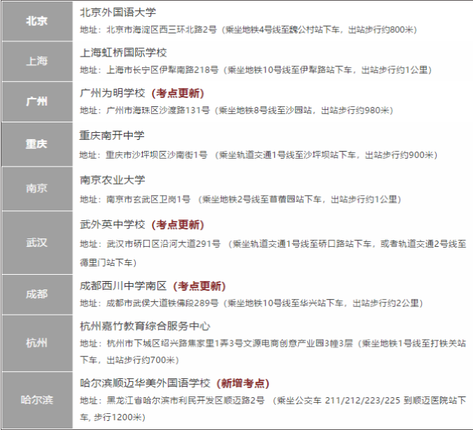 目前大陆地区考点有:北京、上海、广州、重庆、南京、武汉、成都、杭州、哈尔滨