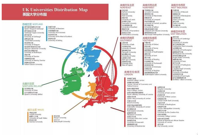 由图可得,大部分英国大学都坐落在英格兰区,其中伦敦区的大学数量最多。 苏格兰区拥有十四所大学,威尔士区拥有五所大学,而北爱尔兰区仅有两所大学。 接下来,留学君将选择几个英国留学热门城市为大家解说。